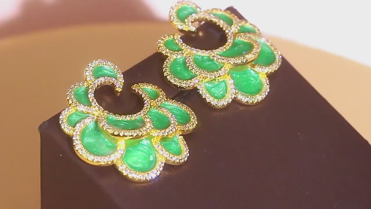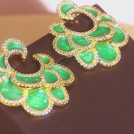 Vivid Green Enamel Multi Layers Leaf Big Symmetrical Stud Drop Earrings