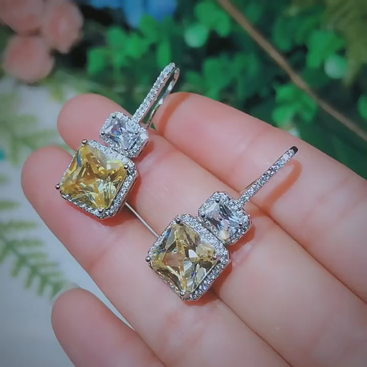 Yellow Stunning Square Cut Cubic Zircon Crystal Drop Silver Plated Hook Earrings